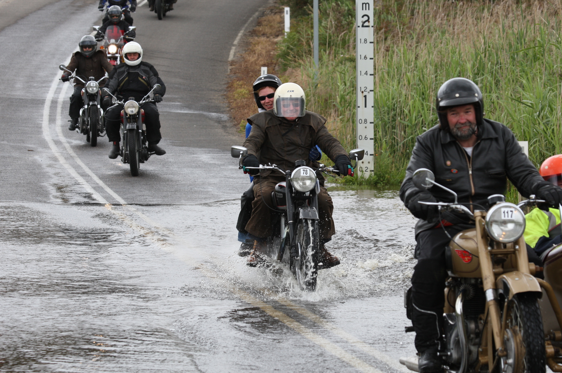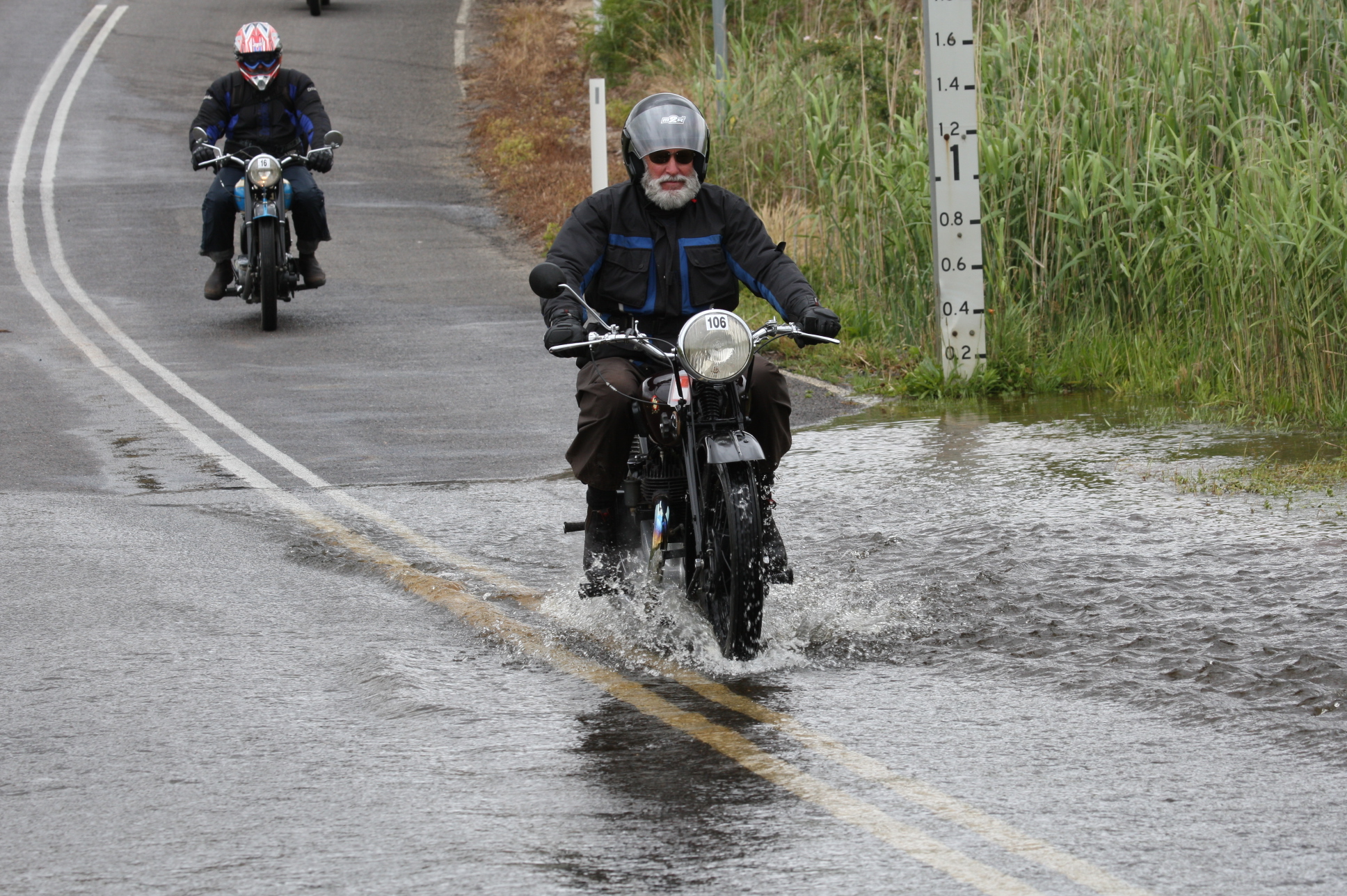The Sunday ride actually started with a display of entrants and some invited guests on the Goolwa Wharf. This lasted for approximately one hour before setting off more inland some 35 kms to Mt. Compass where the news that there was some water across a ford where we were supposed to go and close to the lunch venue. This water was about 75 – 100 mm deep and was (after consulting the people) proven to be one of the highlights of the ride with many different ways to cross water being shown.